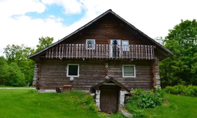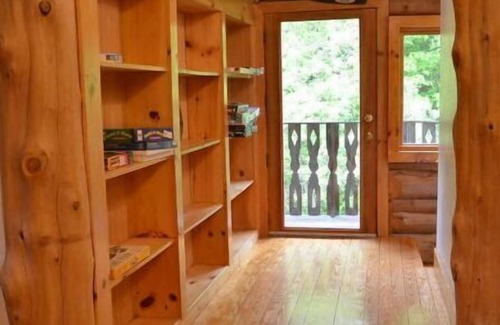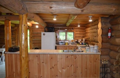 Beautiful, natural, hand-crafted log home features abundant natural wood, a porch, and a special sunroom adjoining an additional upstairs common space. There is an open kitchen/living/dining area with a large living room upstairs and another one downstairs. Upstairs are 3 bedrooms; each bedroom has 1 queen-sized bed. This is a very quiet location on a133-acre property.
