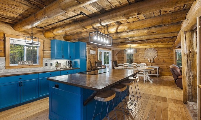 Fun Blend of cool, Modern and country in this hand hewn log home! Located at the getaway to the white mountains! Covered porch and deck wrap around 3 sides, perfect for gatherings and stories. *Private 7 person Hot tub and fire pit for warm nights. Home comes with open concept of Living, dining and extra large kitchen island.