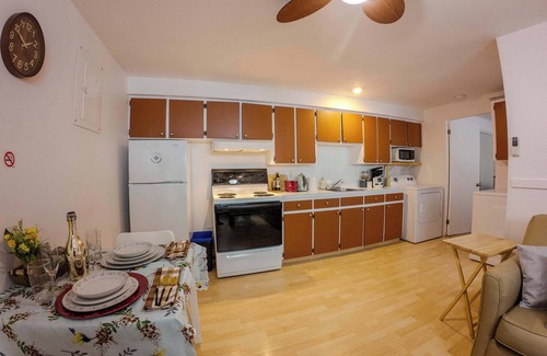 La cuisine est entièrement équipée. D'autres équipements tels que la télévision intelligente, le Wi-Fi, un lave-linge et un sèche-linge sont également fournis. Un espace de travail est également prévu dans ce logement.