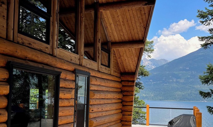Beautiful log cabin fully renovated. Loki Cabin is perched on a 80 foot cliff with a beautiful view of Kootenay lake and Mt Loki.
