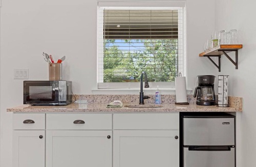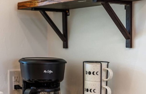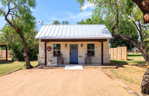 Lone Star Cabin No. 13 is located just 5 ½ miles east of downtown Fredericksburg on US Hwy 290 right in the middle of a number of special destination points. The Cabin is approximately 550 square feet in size with a large Primary Bedroom, King size bed & closet, and large bathroom. The floor plan includes a living room, with seating and a nice coffee bar with sink and cabinets. There is a smart TV in the living room. The Cabin has a front and back covered porch areas with rocking chairs.