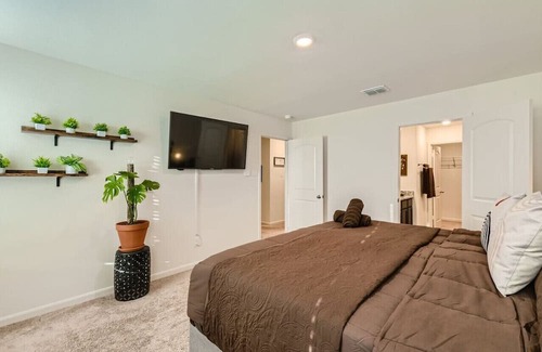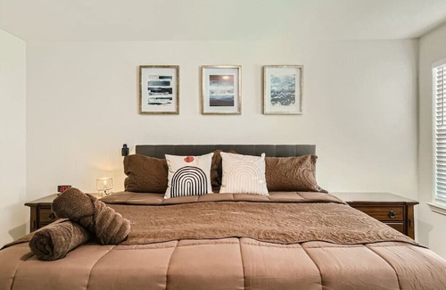 Revel in our master bedroom space featuring a king-sized Purple brand premium mattress, set with soft, high-quality linens for the utmost comfort and a Smart TV with streaming capabilities situated for your viewing pleasure. We offer versatile sleeping arrangements to comfortably accommodate an extra guest. Tucked away in the spacious closet, you'll find a convenient Twin XL foldable bed. This bed can be easily unfolded, providing a cozy and restful sleeping space without compromising the room's main area. It’s an ideal option for those seeking additional privacy or simply an extra bed in a pinch.