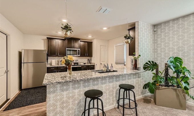 Outdoor Space: Escape to the tranquil outdoor retreat of Lone Star Zen Hideaway, where you can lounge on one of our colorful adirondack chairs by the fire pit under the enchanting Texas sky. Ambient twinkle lights enhance the peaceful atmosphere in the evenings, while the day welcomes you to enjoy games like corn hole. Admire the simple elegance of our desert-inspired garden, featuring cacti and succulents, as you find solace or share laughter under the vast, starry night. Large community park featuring a splash pad, picnic area, playground is perfect for the whole family to run around and enjoy hours of countless fun. For those who enjoy an active lifestyle, there are jogging trails nearby, providing the perfect setting for outdoor exercise and leisurely walks.