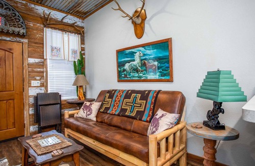 This cozy and romantic rental sleeps up to four, with a queen bed in the bedroom and a queen size pull-out couch in the living area. The full bath has a roomy shower, and all bed and bath linens are provided. If you'd like to stay in for an intimate meal, the kitchens fully equipped, including cooking and serving ware. Central air and heating keep the space comfortable, and there are two Roku TVs on hand for you to access your favorite apps. There is WIFI and great cell service. The vintage Wild West touches blend perfectly with the modern comforts at Lonesome Dove!