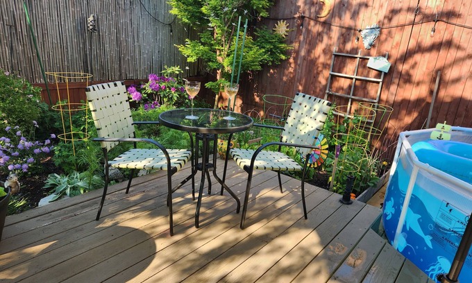 Beautiful newly renovated large one bedroom apt. on ground floor of private home. Contemporary furnishings and new kitchen and bathroom in cool design. Very light with large windows in every room and wood blinds for privacy. Relax in private decked yard area wih new gas bar bque and enclosed outdoor shower. Bedroom has closets and plenty of dressers. Fully furnished with coffemaker, iron, blow dryer, clean white sheets and towels.