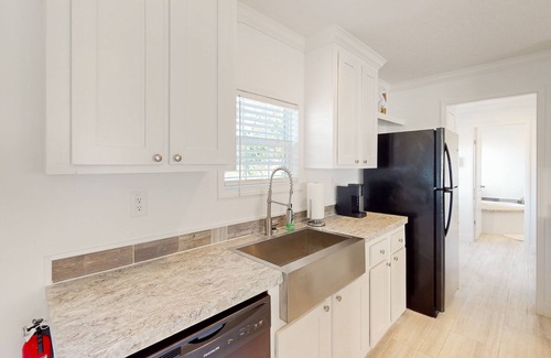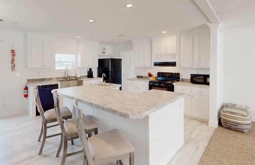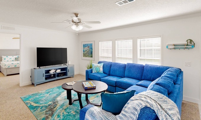 Equally bright and well-decorated, the four bedrooms are filled with natural lighting and a nautical-themed ambiance. When you need some time to yourself, head for the primary bathroom's soaking tub. Central air-conditioning, board games, books, a private washer/dryer, and internet access round out the home's interior perks.