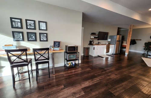 Open layout with one private bedroom and a pull out queen bed incorporated into the leather sectional. Outdoor chairs, fire pit, and picnic tables are located on site for you to use. Dock has open space for you to bring a boat or jet ski and attach it to the installed whip system. 10-foot ceilings, a kitchenette, living space, and a large dining table with views, help for meals. Full Laundry room incorporated for cleaning if necessary.