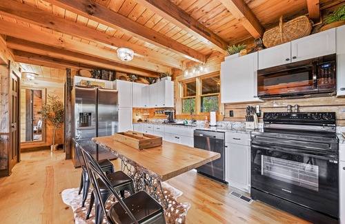 The wraparound deck brings outdoor living in, providing protection from the weather while allowing year-round mountain views. You’ll find a barbecue grill, plenty of outdoor furniture for romantic sunset-watching, porch swings for lazy afternoons, games, a custom alfresco dining table, and a bubbling hot tub for relaxing muscles after a day of adventuring. Roast marshmallows and tell scary stories under the stars at the firepit - with absolutely stunning views of what our galaxy can offer.