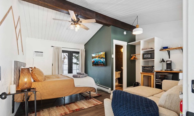 The Long's Peak room sits alongside our 3 lodge/hotel style rooms. The suite boasts a king bed with a loveseat to relax on as well as a balcony to take in the nature around you. Additionally, there is a walk-in steam shower with heated floors. The suite also has a kitchenette equipped with a small sink, dishes/utensils, toaster oven, coffee/tea/hot chocolate maker, and a closet.