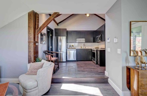 Longpond Cellars & Farms Main First Floor and Loft are 2 separate apartments in one building. The Main floor has a kitchen and dining area for all company, with a huge fireplace, including 6 person Sauna off the soaking tub/shower bathroom, King Size Bed, large TV