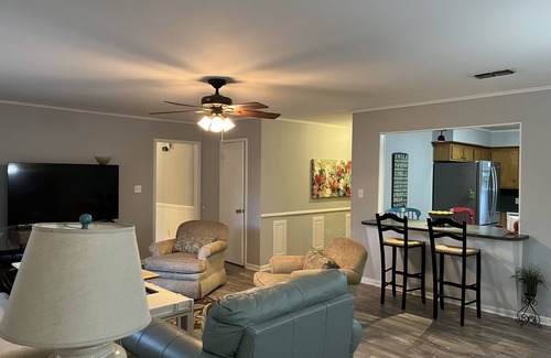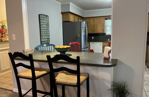 Quiet Pine Tree north Longview neighborhood, large trees, all one level, easy access without stairs. Set up with your comfort in mind. Quality mattresses. Flexible 3 roll away twin beds for versatile needs. Fenced back yard for quiet evening on back porch , morning coffee, family pet stay or safe area for kids to play.