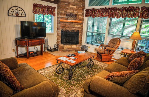 Home features 3 bedrooms, 2 bathrooms with a nice wooded view, an open floor plan, living room with fireplace, furnished kitchen, dining area, a screened in porch, washer/dryer, a ramp with a charcoal grill on the deck and has an optional meeting room downstairs. You would have 2 Queen beds upstairs in the loft and down stairs you will have a bedroom with 2 twins and 1 King bedroom.