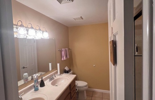 This bedroom includes a king size bed, small tv with access to Amazon Prime Video. Double vanity bathroom featuring a jetted bathtub (shared if other bedroom is occupied) , and essential amenities to include washer/dryer, coffee maker, heat, etc.