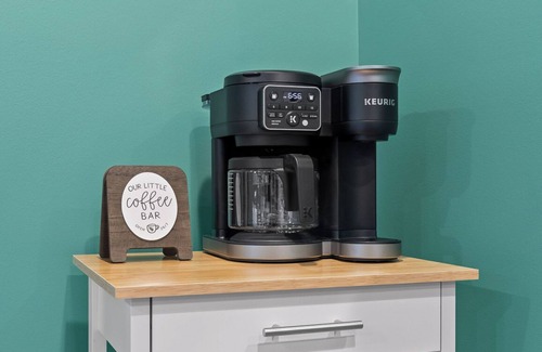 The kitchen is stocked with Keurig Single Serve & Carafe Coffee Maker, single serve coffee pods, cream + sugar, and hot chocolate single serve pods. We also provide olive oil and spices for your use and soap (dish, hand, & dishwasher).