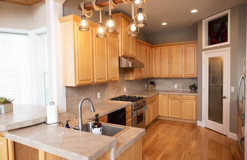 Enjoy your morning coffee on one of the two spacious decks as the sun gently rises over the trees surrounding the lake while you plan your day's events. Make use of the numerous watercraft available (kayaks, paddleboards, canoe) or bring your own boat to moor on the private dock (moorage available on request). Or, simply relax in the gazebo on the water with a good book. Gather for games around the large family table in the living room while still enjoying views from the floor to ceiling windows. Enjoy a movie on the 65" flat screen TV in the lower level media room. High speed wireless internet ensures everyone can utilize their devices without interruption. Prepare the evening’s meal over the four burner stove in the kitchen, or step directly out onto the upper deck to prepare the day’s catch on the gas grill. After dinner, sink into an Adirondack chair and enjoy a sublime sunset around the firepit on the beachside patio as you recount the day’s events while looking forward to what tomorrow holds. When it’s time for bed, retire to one of the tastefully appointed bedrooms (five bedrooms in main house), or opt to sleep in the adjoining “apartment”. The apartment is connected to the main house, yet has its own entry, and features a full kitchen, two bedrooms (one with king bed and one with two bunk beds), small loft with full bed, and a 50" flat screen TV.