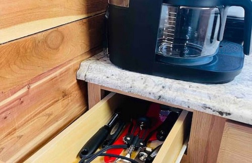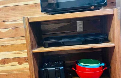 The kitchenette is stocked with basic cooking supplies, a full size refrigerator, 5 gallon water dispenser, farm style sink, keurig coffee maker (makes a full pot or single cup), a microwave, double hot plate for cooking inside, plates, bowls, cups, coffee mugs, wine glasses, silverware, knife block, cutting board, and grilling utensils.