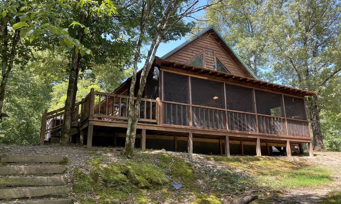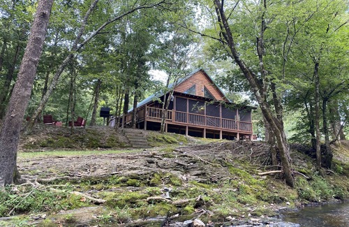 This beautiful property is called The Lost Cabin at the Creek because it is an excellent place to disconnect, escape and relax. The creek provides great opportunities for fishing, swimming, exploring, viewing wildlife, and generally enjoying the outdoors. The cabin was constructed in 2013 and provides two bedrooms, a sleeping loft, bathroom with shower, well equipped kitchen, gas log fireplace, screened-in back porch, hot tub, charcoal grill, fire pit, and all the amenities necessary to enjoy your stay. The cabin sleeps 6 people with both bedrooms having queen size beds. The loft is furnished with 2 twin beds.