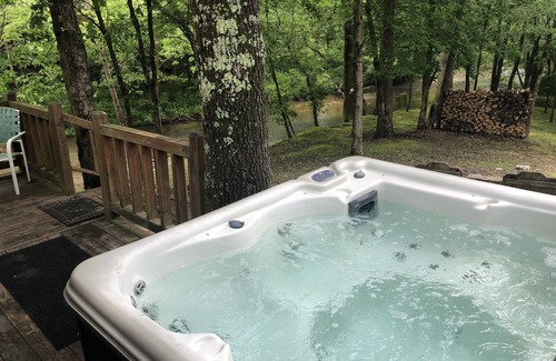 The Lost Cabin sits directly on 600 feet of the banks of Lick Creek, running the entire length of the property. The creek is spring fed and runs year round. On the back of the cabin is a screened-in porch which leads to the outside deck and a 4-person hot tub. All of these areas provide great views of the creek. Next to the back porch is a cooking and entertainment area that includes a charcoal grill with outdoor seating, and a fire pit (wood provided). The outdoor entertainment area gently slopes down to water for easy creek access. The creek has formed a natural swimming and fishing area. The land across the dirt road is a part of Lost Cabin at the Creek property, so please enjoy the amenities there as well. The swimming hole is across the dirt road. Rushing water over the rock formation provides relaxing sounds and another great area to enjoy the creek.