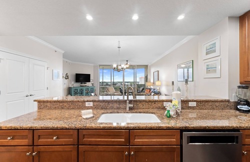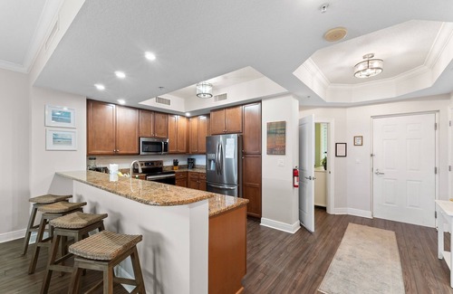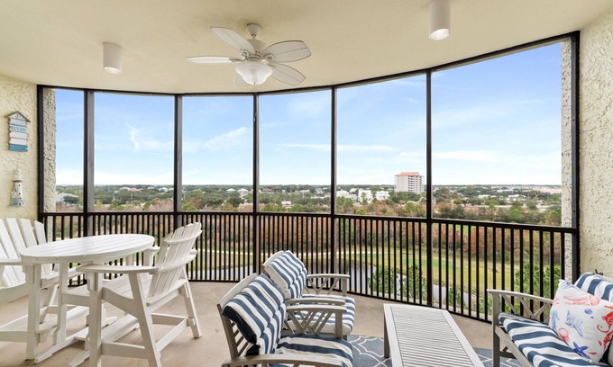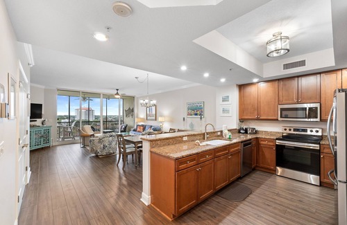 Experience Perdido Key's premier golf resort at Lost Key Golf and Beach Club by staying in this stylish 2-bedroom, 7th-floor condo. Featuring contemporary décor, luxury furnishings, and stunning views, this unit offers the perfect getaway. The living area includes a large TV and access to a screened lanai overlooking the golf course, Old River, and the Intracoastal Waterway. The gourmet kitchen is fully equipped with modern appliances and a breakfast bar for extra seating, ideal for preparing delicious meals.