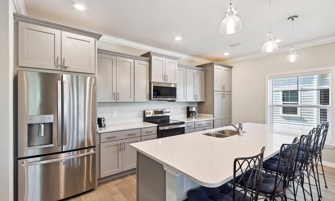 Modern, Fully Equipped Kitchen with Quartz Countertops and Center Island, Stainless Appliances