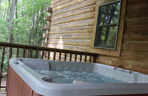This cabin features a gas fireplace, TV with the basic Dish Network package, DVD, a spacious covered front porch deck with private hot tub and gas grill, dishwasher, and furnished with central heating and cooling.
