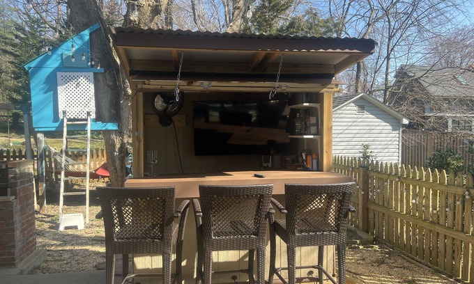 Walk downtown or to grocery, restaurants, etc. We live in a nice modernly decorated duplex adjacent to Navy Stadium. It is a close-proximity neighborhood. We live in one half (it is our primary residence but i rent it sometimes to make extra income as a disabled veteran) & someone else lives in other but there's a privacy fence & all amenities listed are ours only. It is an easy walk to all the popular sites. We've unlimited, free parking & many, many amenities. We've lovely deck w/ built-in fireplace, hot tub & relaxing furniture. Backyard is a fantastic, fun place for whole family. There’s a tree house, bocce, cornhole, horseshoes, tic-tac-toe. There's an outdoor bar w/flat screen tv, so you can watch movies or games from hot tub. Upstairs from main level king master bdrm (ensuite w/ full bathroom) , 2 bdrms w/ queens (one w/ a TV) as well as full bath in hall. On main level theres a kitchen w/ small table/chairs, dining w/ seating for 8-10, living area w/electric fireplace, massage chair, sofa, smart TV, bluetooth speakers & enough seating for 10. No bedrooms on main level (must use stairs). There's also a 1/2 bath. Downstairs to lower level is a hall with lots games, books & crafts. 3 rooms on lower lever.- a laundry area w/ washer, dryer, extra frig & lots of storage w/ extra pillows, sheets, party supplies, etc. On lower level there’s a room w/ queen bed. 3rd lower level room has two double futons that can be opened as bed for 2 or used by one as is. Theres a small exercise area w/peloton, yoga eqpt, weights,bands, etc. Lots of games, dart board, a "music area" w/ guitar, keyboards, karaoke , etc. Amenities incl exercise eqpt, peloton, bikes, vitamix, Wi-Fi, several TV's , dining table seats 8, 2 frig/freezers, blankets, coolers, tons games, towels/pillows, picnic stuff, etc. hardwood floors on main/upper floors. We've hosted hundreds in our home & love providing a great vacation experience. This is NOT a party house - it is for nice family gatherings or relaxing getaways w/ few close friends. You many Not have any parties or events without our advance permission - If we get noise complaints we have the right to remove you from the premises. WE WILL NOT TOLERATE UNAUTHORIZED GUESTS OR PARTIES.