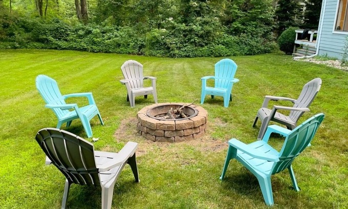 Outside, the yard invites the kids and dogs to run and play. There’s seating for 8 at the bonfire and an outdoor umbrella is available for those hot, sunny days. The driveway has plenty of parking for several cars. We have a garage, but please note that guests do not have access to it. Did we mention that your dog is welcome?!! We require the dog be fully housetrained and leashed (or on a line) at all times. A flat $100 non-refundable pet fee is required for up to two dogs maximum.