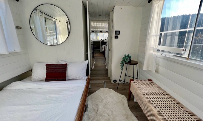 This floating Air BnB is attached to a dock as part of Cape Carraholly Retreat, nestled in British Columbia's old growth, oceanfront rainforest. Floating on your docked oasis, affectionately dubbed the “Floating Love Nest”, you will truly experience being off the grid with a state of the art solar power system that provides you with ease as you utilize small appliances (microwave, hair dryer etc.) throughout your stay onboard. This unique, floating AirBnb offers an incomparable open concept and a lounging space inviting you to get cozy by the warmth of an outdoor gas fire pit on the rooftop of the boat, or relax on the large custom design patio furniture. Perfect for any season and a unique experience for treating that special someone! There are 2 double beds, suitable for a maximum guest capacity of 4 guests. The kitchen is equipped for all of your cooking needs and contains a stovetop, oven, mini fridge, microwave, and much more.
