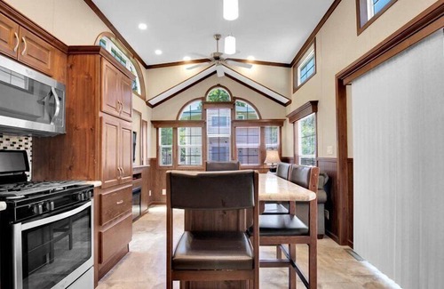 This park model home boasts a single bedroom furnished with a queen-size bed, ensuring comfort with its cozy mattresses and provided air conditioning for a peaceful night's rest. The cabin comfortably accommodates 5 guests, it also features a cute little loft, perfect for the kids to "camp out" on air mattresses.
