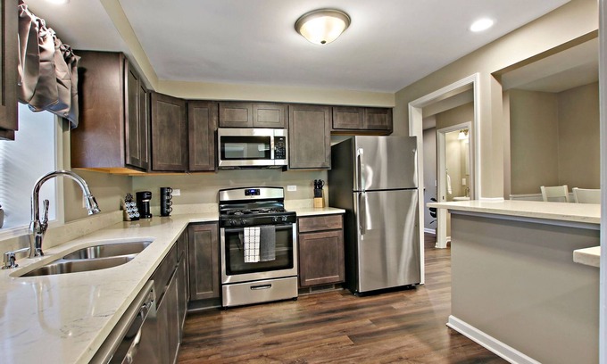 The kitchen sparkles with shining stainless steel appliances and smooth spacious countertops. There’s everything here to feed a crowd or fix a late-night snack for two. Appliances include a full-size refrigerator and stove with oven, an under-counter microwave, dishwasher, and Keurig coffee maker. We supply a knife set, pots and pans, and dinnerware to bring your culinary ideas to life.