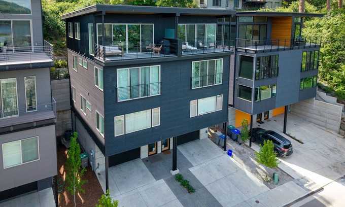 Stevie's View is a very lovely brand new townhome perched up just one street (and an easy walk, near the STAIRS) from the downtown core. Big views of the waterfront, and downtown from the balcony and north-facing windows. Room for everyone with 4 full bedrooms/ 3.5 baths, plus a bonus/media room with a pullout. Contemporary, high end finishes throughout. Quartz counters, engineered hardwood, SS Bosch appliances & white oak cabinets. Maximized views with reverse floor plan and living/ kitchen on top floor to enjoy the views. Large garage will accommodate cars and toys. There are 4 floors with many stairs. No smoking. No pets. License #784