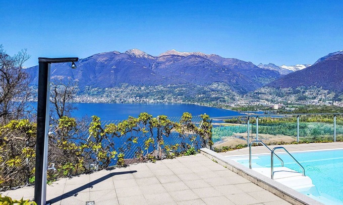 "Splendid Maggiore View", 3-room maisonette 120 m2 on 2 levels, north-west facing position. Object suitable for 4 adults + 1 child. Spacious and bright, comfortable and modern furnishings: open large living/dining room with panoramic window with dining table, kitchen corner, TV, flat screen and DVD. Exit to the terrace. Open kitchen (oven, dishwasher, 4 ceramic glass hob hotplates, toaster, kettle, electric coffee machine, Capsules for coffee machine (Nespresso) extra). Sep. WC. Floor heating. On the lower ground floor: shower/WC. Upper floor: (spiral staircase), 1 double bedroom with 1 bed (90 cm, length 200 cm), 1 french bed (140 cm, length 200 cm). Exit to the balcony. 1 double bedroom with 1 double bed (160 cm, length 200 cm). Exit to the balcony. Bath or shower/WC. Balcony 15 m2, north-west facing position, large terrace 32 m2 partly roofed, north-west facing position. Terrace furniture, barbecue (portable), deck chairs (2). Please note: non-smokers only. The apartment is spacious, bright and comfortable, with modern furnishings. It features a large living area that flows seamlessly onto a large terrace, creating a harmonious blend of indoor and outdoor spaces. The expansive terrace extends the living space and provides ample room for relaxing and entertaining, while also offering breathtaking views of the lake and mountains. As day turns to night, the terrace becomes a perfect vantage point for enjoying the sunset over the mountains and the twinkling lights reflected in the tranquil lake, both from the stars and from the surrounding towns and villages. The rooftop swimming pool offers magnificent views of the shimmering lake and majestic mountains. The apartment is located in a quiet cul-de-sac, next to a waterfall and hiking trails. NL-00007133