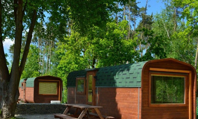 Child friendly holiday village "Kemp stříbrný rybník". 25 houses in the resort. In the district of Malšova Lhota, 5 km from the centre of Hradec Králové, along the wooded area, on the lake. For shared use: property. Table tennis, boccia (extra), beach volleyball, arbour, barbecue, fireplace, children's playground, bathing jetty. In the complex: reception, restaurant, bar, bistro, playroom, washing machine (for shared use, extra). Parking on the premises. Sandy beach, natural swimming pond 10 m. Sports harbour, minigolf, sports centre, walking paths from the house, cycle lane, fishing possibilities 10 m. Nearby attractions: Adventure park Firmsport, Gladiator race arena, letní kino, tutistický vláček do lesa, Stezka siluet, Rytířské hradiště 3 km, Park Na Větvi 3 km, Obory se zvěří 4.2 km, Obří akvárium, Botanická zahrada 4.7 km. Hiking paths: Pohádková, Vodnická stezka 6 km, Planetárium, planetární stezka 8.4 km, Zoopark Stěžery, Rozhledna Milíř 15 km. Please note: entertainment in the season. Suitable for families. Fishing [permit required]. The photograph shows a typical example.