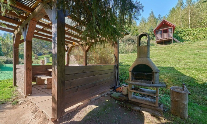 Experience a cosy country getaway at Chlívce u Hronova, a detached two-story house located 8 km from Hronov. This holiday rental offers a private swimming pool (seasonal availability from July 1st to August 31st), a yard with an arbor, garden furniture, a barbecue area, a fireplace, a barbecue house, and a children's playground. Enjoy on-site parking, internet Wi-Fi, and the option for an installment plan.