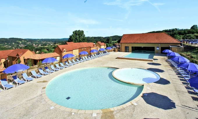 Child friendly resort "Les Coteaux de Sarlat". 100 houses in the residence. 2.5 km from the centre of Sarlat-la-Caneda, on the outskirts, 50 km from the centre of Brive, on a slope. For shared use: property 30'000 m2 (fenced) with lawn and trees, swimming pool heated (17 x 7 m, depth 100 - 140 cm, seasonal availability: 11.Apr. - 24.Oct.). Children's pool, table tennis, basketball, boccia, children's playground. In the complex: reception, sauna (extra). Fitness room, steam room (extra). Washing machine, tumble dryer (for shared use, extra). Bread roll service. Parking on the premises. Shop 1.7 km. Minigolf 100 m. Please note: Loading and unloading of baggage is possible at the holiday house. The photograph shows a typical example. The holiday properties may differ in living space, floorplan, equipment and furnishing.