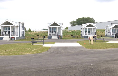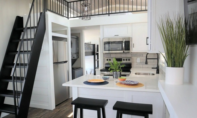 Luxury waterfront cottage. Property includes a heated pool, personal fire table, picnic table and charcoal grill. The front porch view is Sandusky Bay. The cottage is fully appointed with all cookware and linens. The primary suite includes a queen bed, TV and closet with privacy. The cottage also has a loft (you cannot fully stand up in the loft) with a queen bed. The downstairs includes a bunk bed, living room area with fireplace and TV as well as a full bathroom and kitchen. If you have ever wanted to experience a "tiny house," this is your chance! We have a beautiful view of Cedar Point. The property is gated and requires an access code for all guests. We are minutes away from Cedar Point and downtown Sandusky, OH. Each cottage can park 1 vehicle. Overflow parking is available. Not only does our area include Cedar Point, but Downtown Sandusky has may restaurants, bars and shopping. You can ax throw, play "old school" bowling and eat the best tacos in town! Take a stroll on Jackson Pier or take a ferry to Put-in-Bay. The box stores and restaurants are 5 minutes away on Rte 250. If you want to tuck away and have a quiet or romantic get-away, you have options. Schedule a massage with Riverbend Massotherapy or get a bottle of wine at Vine and Olive and take home fantastic gyros. Create the perfect vacation with Bayfront Resort! (ID Required. Min. age is 25 to book.)