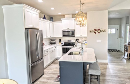 Inside you will find an open great room, kitchen, and dining room floor plan. This beautifully decorated 3 BR/2 BA home has a beachy feel throughout, including shiplap in the entry, great room, dining room, and master bathroom. All bedrooms have carpet flooring. The well-equipped kitchen has quartz counters, stainless steel appliances, and plenty of prep space.