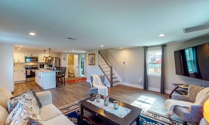 This colonial-style home offers a beautiful stay close to downtown Parkville. A wide variety of dining and local attractions are also nearby.