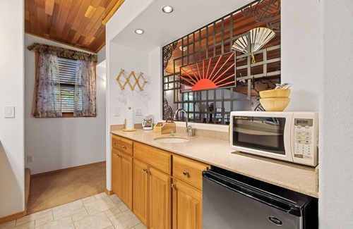 Spectacular. Asian feng shui motifs and decor transport guests to a timeless, far distant calm and serenity. The king-size bed has been lowered to simulate the floor-level rice beds of Japan, and the owner-built headboard not only incorporates a lumbar-support feature but also matches the custom iron railing, lamps, flowering tree and side tables. The bath continues the Asian theme with a spacious custom marble walk-in shower and a large corner whirlpool tub--one wall of which houses a second TV with stereo sound. A local artisan crafted the stained-glass shower window and door. Behind the oriental screen above the headboard are a kitchenette area with microwave, coffee maker, and refrigerator and a morning make-up and primping area. Below the foot of the bed is a sunken sitting room with a love seat, recliner, fireplace and built-in surround sound satellite TV/DVD system. The semi-detached suite has convenient ground-level access from the parking area, an interior entrance from the main front porch, and off the sitting room area a private porch with steps to the oriental garden and outdoor spa.