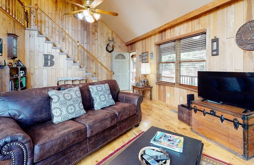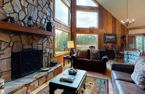 You'll love watching your kids playing in the wide-open space surrounding this majestic mountain home. Inside the cabin features high vaulted ceilings, hardwood floors, an open-concept layout, and lots of natural light cascading through large windows with beautiful views. After a day in the river, crank up the wood-burning stone fireplace to stretch out over super-comfortable furniture and catch up on a good book. Clean your catch of the day then throw it over the grate of the gas grill for a delicious fish dinner. Use the full kitchen to whip up some fantastic side dishes.