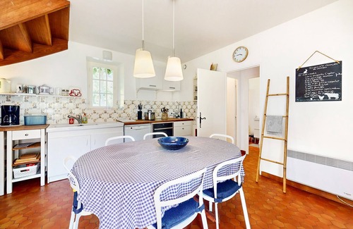 Enjoy a wonderful stay with your extended family in this large and cozy stone house. With its simple comfort and rustic charm and large open fireplace, you will find beautiful areas to relax and socialize. A large room with sloping ceilings is at your disposal and has a table football table.