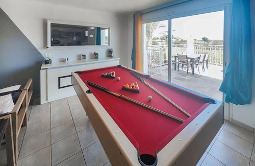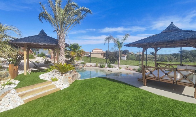 Enjoy an unforgettable vacation in the south of France in your beautiful vacation home in Villespassans. This picturesque commune in the heart of the Languedoc offers the ideal retreat for relaxation and nature experiences. When serving your family breakfast together, you have the option of using the beautiful indoor dining table or going straight out onto the spacious terrace. From there, it's not far to the refreshing experiences in your pool, which is surrounded by palm trees and Mediterranean vegetation. Let yourself be enchanted by the peaceful atmosphere and make use of the barbecue area for sociable evenings outdoors with a glass of local wine. The stylishly furnished living room invites you to linger. Enjoy cozy hours on the comfortable sofas and end the evening with a good movie.