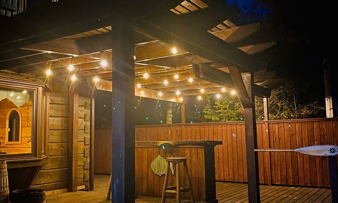 Relax at waterfront log home , minutes from shops , golf and restaurants, enjoy coffee/tea in covered front porch while listening to bird sounds , spacious screened sunroom in the backyard with lake view for sunset . A separate deck and a fire pit close to water to enjoy the shadow of moon in the night