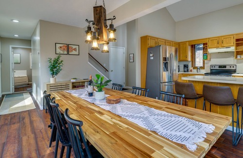 HOME HIGHLIGHTS: Smart TV, fireplace, laptop-friendly workspace, furnished deck, fire pit, outdoor dining area, trampoline