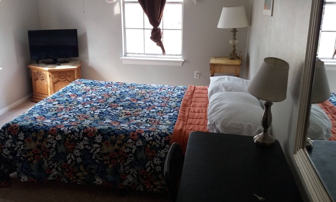 Private room with comfy Queen bed, desk, smart tv and shared bathroom located in a lovely 2 story 4 bedroom, 2 bath house in Kingwood/Humble area with over 2000 square feet and large backyard open to a green belt with no back neighbors.