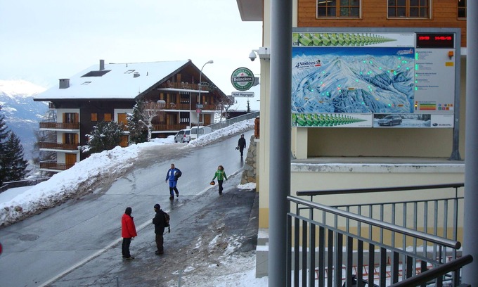 Probably the best location in Veysonnaz. Only 50m away from the cable way Veysonnaz-Thyon 2000. A peaceful and beautiful apartment with room for maximum 6 people located on the -1th floor of the chalet "Les Mélèzes". Cosy living room, flat screen TV, DVD, WiFi and sitting corner. Dining area with rugged table, sitting and chairs. Open kitchen, fully equipped with fridge (112 L) plus deepfreezebox ( * *** 17 L ), ceramic hob (4 rings), microwave, electric oven, dishwasher, electric kettle and Nespresso coffee machine. Cabinet with vacuum cleaner, iron and hair-dryer. Main bedroom with double bed (160x200 standard : two one-person duvets and two pillows supplied ) and private bathroom (shower) and cabinets. Main bathroom with lavabo, bath and toilet. Second bedroom with 2 beds (90X200 standard : two one-person duvets and two pillows supplied ) , cabinets and lavabo. Entry hall with 2 sleeping bunks in closed cabinet ( standard: two one-person duvets and two pillows supplied). Large (20m2) balcony with stunning view over the Rhone valley and beautiful mountains (outside table, chairs).