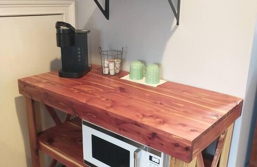 Convenient Amenities: Coffee, coffee, coffee. Keurig provided with multiple k-cups of premium coffee and creamer - loaded and decaf. Microwave also available. Parking is available right outside your door, and you can come and go freely without disturbing anyone.