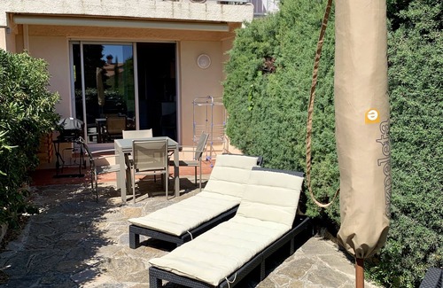 The access to the beach is made directly from the garden, as are the local shops, restaurants, private beaches and bar. The studio itself is located on the ground floor of a charming residence with private and secure parking. Recently renovated, it offers most modern equipments: flat screen TV, washing machine, internet, dishwasher, oven- microwave, electrical WEBER barbecue, air conditioner ,garden, tennis court, bikes(on request). The garden terrace (35m2) is a haven of peace. South facing, it's perfect for relaxing in the sun or enjoying lovely meals and barbecues.This charming studio comes with a fully equipped bathroom (shower)including a power shower and washing machine and a towel heater.
