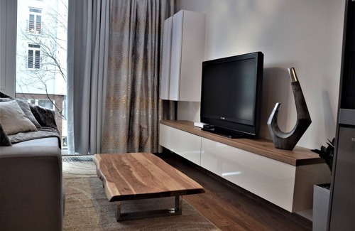 The living room includes a flat-screen TV with free streaming services such as Netflix, Disney+, and Amazon Prime, numerous local paid TV channels, and radio stations, providing a wide range of television entertainment. Complimentary Wi-Fi is available throughout the apartment. Guests have access to a large bed with a premium high mattress and comfortable cotton bedding. There is also a private bathroom with complimentary toiletries, a hairdryer, a washing machine, a toilet, and a shower. The equipped kitchenette includes a stove, oven, microwave, large refrigerator, kettle, coffee maker, and blender. The kitchen is fully stocked with dishes, glasses, and cutlery. For our guests, we offer complimentary Nescafé coffee capsules in various flavors, tea, still water, and a small gift in the form of a golden liquid typical of the Czech Republic.