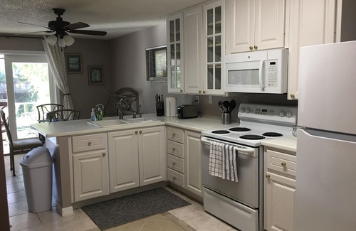 Enjoy your stay in this 4 bedroom 3 bath, upstairs/downstairs cottage home overlooking a peaceful waterway in Rustic Hills neighborhood in Palm City, Florida. It is an adorable frame home newly remodeled. Whether you seek adventure or relaxation, this property has it all! If you wish to stay on land, the patio and dock offer a tranquil place to put your feet up and enjoy the views. Kayaking the river is available on the kayak on premises. There are parks on the water to bike ride to as well as grocery and amenities. The cottage has two kitchens both fully equipped for you to enjoy a home cooked meal with your travel companions, or there are restaurant options nearby if you would like to enjoy a nice evening out! See our listings in our welcome letter when you arrive.